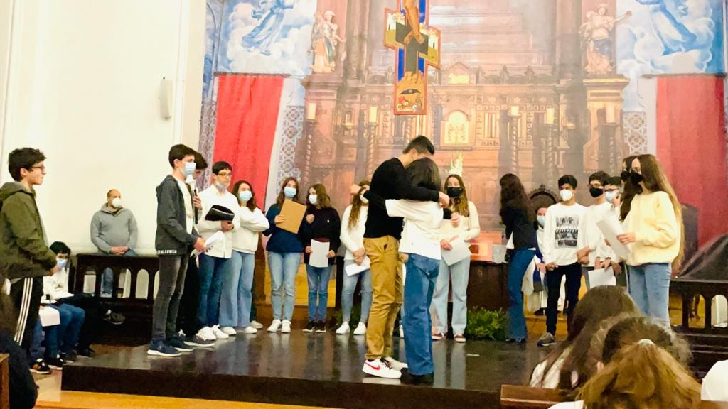 Durante a Quaresma os jovens do 3°ciclo foram convidados a partilhar da vivência da Via Sacra. O tema da Via sacra versou o caminho doloroso de tantas pessoas, individualmente ou coletivamente, no tempo de pandemia. O convite foi aceite pelos jovens da comunidade que, sem mais demora, iniciaram a preparação deste momento, dividindo-se em grupos distintos (dança, expressão corporal, música, leitura e artes plásticas). Nos ensaios interpretaram o texto proposto e foram responsáveis por tomar todas as decisões envolvidas na sua interpretação, fomentando a ligação entre os grupos para um propósito comum. Ao longo do curto período e reduzido número de ensaios foi necessário o esforço e dedicação de todos os envolvidos, que resultou numa Via Sacra vivida e sentida em pleno. A alegria dos jovens em sentir-se parte da comunidade, em ser escutados e vistos e em fazer parte da vivência, contagiou todos os presentes e reforçou a necessidade de repetir estes momentos… de dar o passo, de transmitir uma mensagem de Esperança.