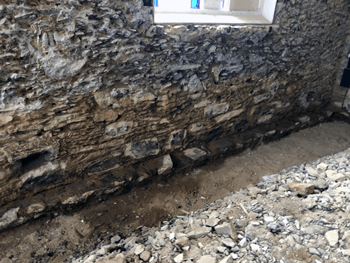 Após a intervenção no exterior do mês passado, avançou-se no interior com a remoção de massas antigas que impediam as paredes ou que já se encontravam podres para que pudessem respirar. Depois de secar, iniciamos a regularização das mesmas com massas e produtos apropriados para garantir o bom isolamento.