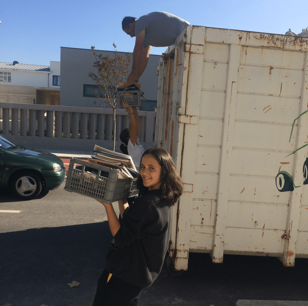 Juntamente com outros adolescentes, jovens e adultos, recolhemos cartão, papel, caixotes, caixas, livros e jornais para dentro de um grande contentor. No final da manhã, tínhamos o contentor cheio e o espaço onde todo o papel estava guardado, quase completamente vazio.