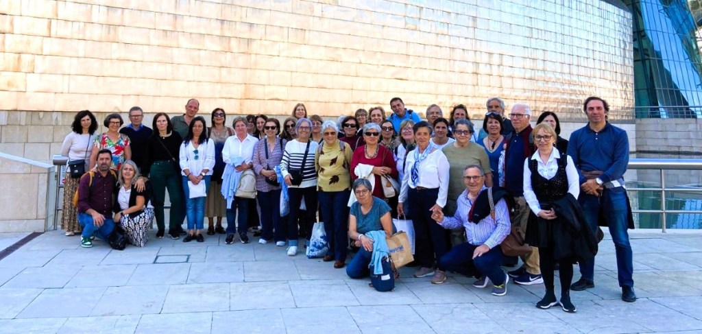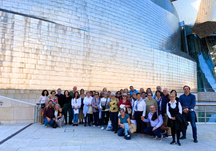 A visita à cidade de Bilbao iniciou-se no museu Guggenheim, inaugurado em 1997. Neste, tivemos uma visita guiada às galerias, onde pudemos observar o seu acervo em arte moderna e contemporânea, assim como a sua arquitetura interior. Em seguida, fizemos a visita ao exterior do edifício e à sua envolvência. É de realçar que o próprio edifício é uma obra de arte. Tem a forma de um navio, revestido de placas de titânio, que reflectem a luz solar, dando-lhe tonalidades diferentes ao longo do dia. Ainda é possível observar, junto ao edifício, esculturas, nomeadamente a “Mãe”, em forma de aranha, e, “Puppy”, em forma de cachorro.